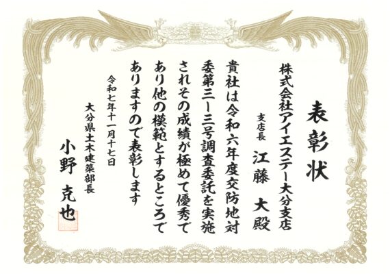 令和7年度 大分県優良委託業務表彰投稿日 : 2025年12月24日令和7年度 大分県優良委託業務表彰(土木建築部長表彰)を受けました。件名:令和6年度 交防地対委 第3-3号 調査委託 管理技術者:江藤 大 担当技術者:大鶴 泰史 お知らせ一覧