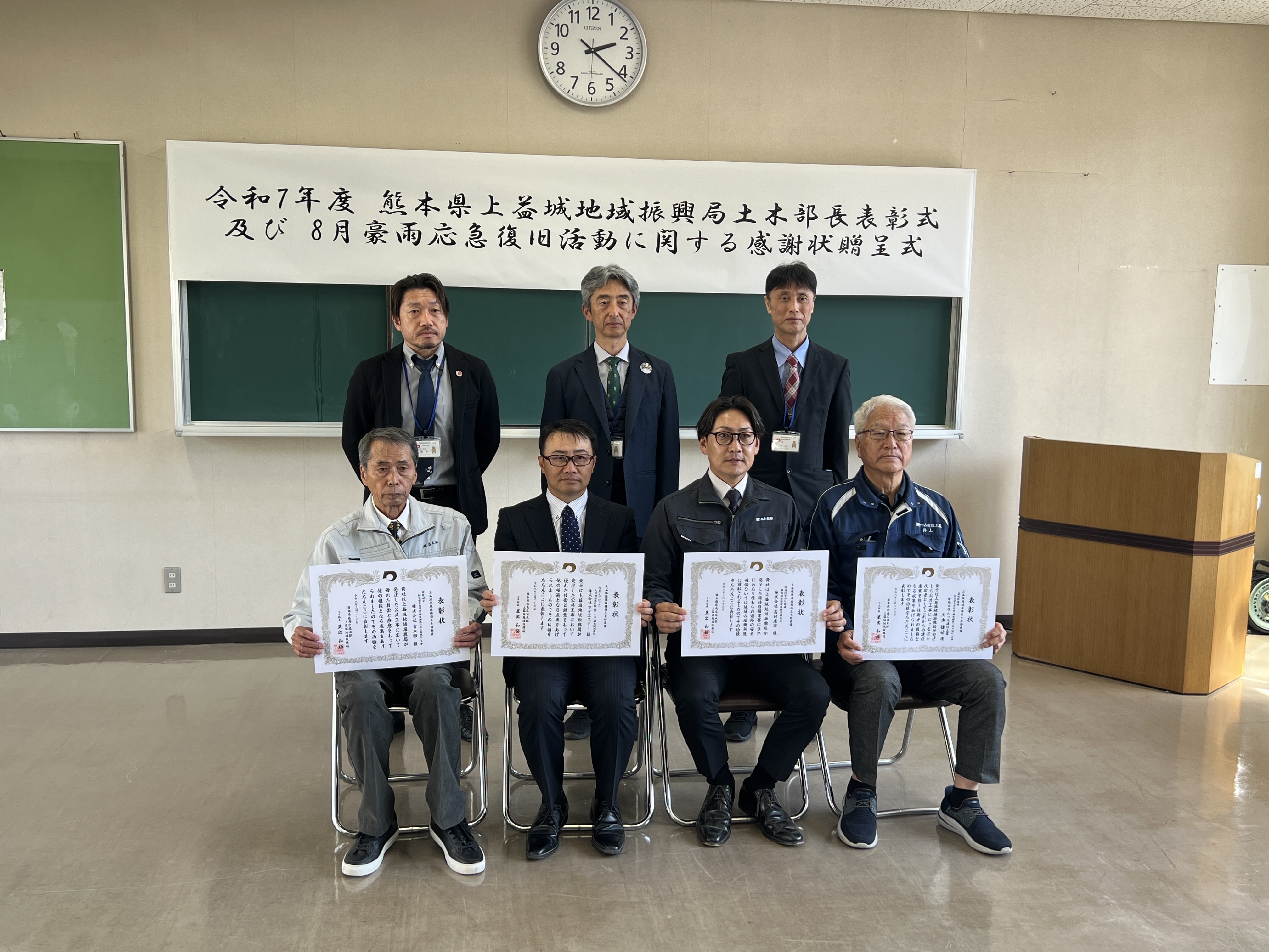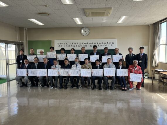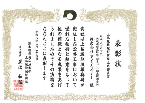 令和8年3月26日に、熊本県県央広域本部上益城地域振興局土木部から土木部長賞を頂きましたので、表彰式に出席してきました。