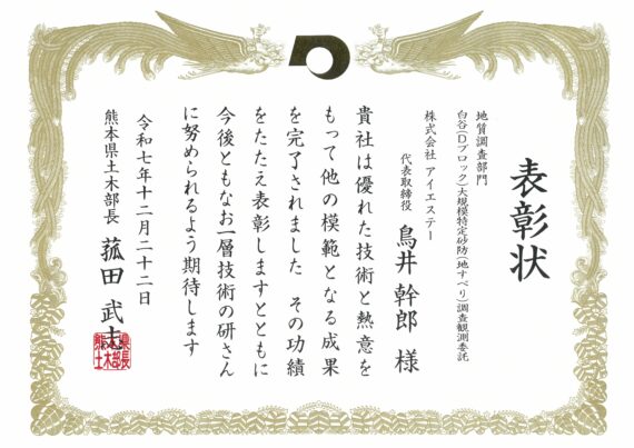 令和7年度 熊本県優良委託業務等表彰投稿日 : 2025年12月24日令和7年12月22日に熊本県若手建設技術者、優良委託業務等及び優良下請者表彰式が開催されました。 弊社は、優良委託業務の地質調査部門にて表彰を受けました。件名:白谷(Dブロック)大規模特定砂防(地すべり)調査観測委託 管理技術者:原田 康弘 担当技術者:大鶴 泰史 お知らせ一覧